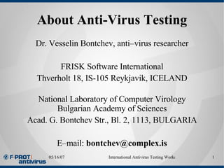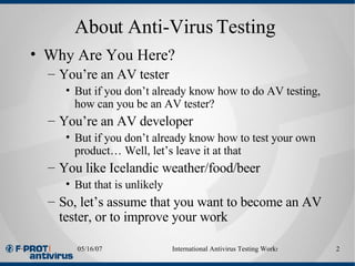 TestMyAV.com Giving you the malware, testing guides and tools you need to test antivirus products for yourself. Trust yourself, not the "experts". Malware Testing Guides. All Our Resources. All Free. Malware. Get your hands on fresh malware for testing your antivirus software and maybe mutate it yourself with a packer. Tools. Recommended software and ...