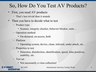 How to Test Antivirus (Is it Really Working and Protecting ... Instead of using real malware that can potentially do real damage on a PC, this test file allows people to test their antivirus applications without having to use a real computer virus. It is a basic text file, but antivirus makers have set the EICAR string as a verified virus, and created a signature that virus scanners can detect.