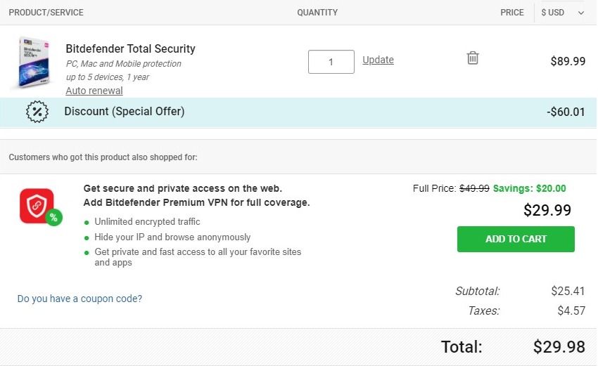 Bitdefender Deals - Exclusive Discounts and Offers for ... The Bitdefender Auto Renewal Plan is designed to save you time, effort, and minimize your vulnerability risk by extending your subscription automatically before you run out of protection. The price offered is valid for the first year of subscription. After that, your subscription will be billed at the applicable renewal price;