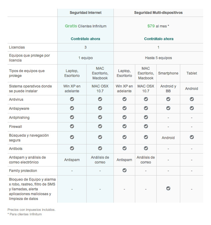 Preguntas frecuentes sobre Antivirus - Telmex McAfee ofrece este mismo producto en otras tiendas de retail tanto físicas y en línea. Sin embargo, Telmex preocupado por la seguridad de nuestros clientes Infinitum, logró una alianza importante para que puedan disfrutar de un producto de calidad sin costo.