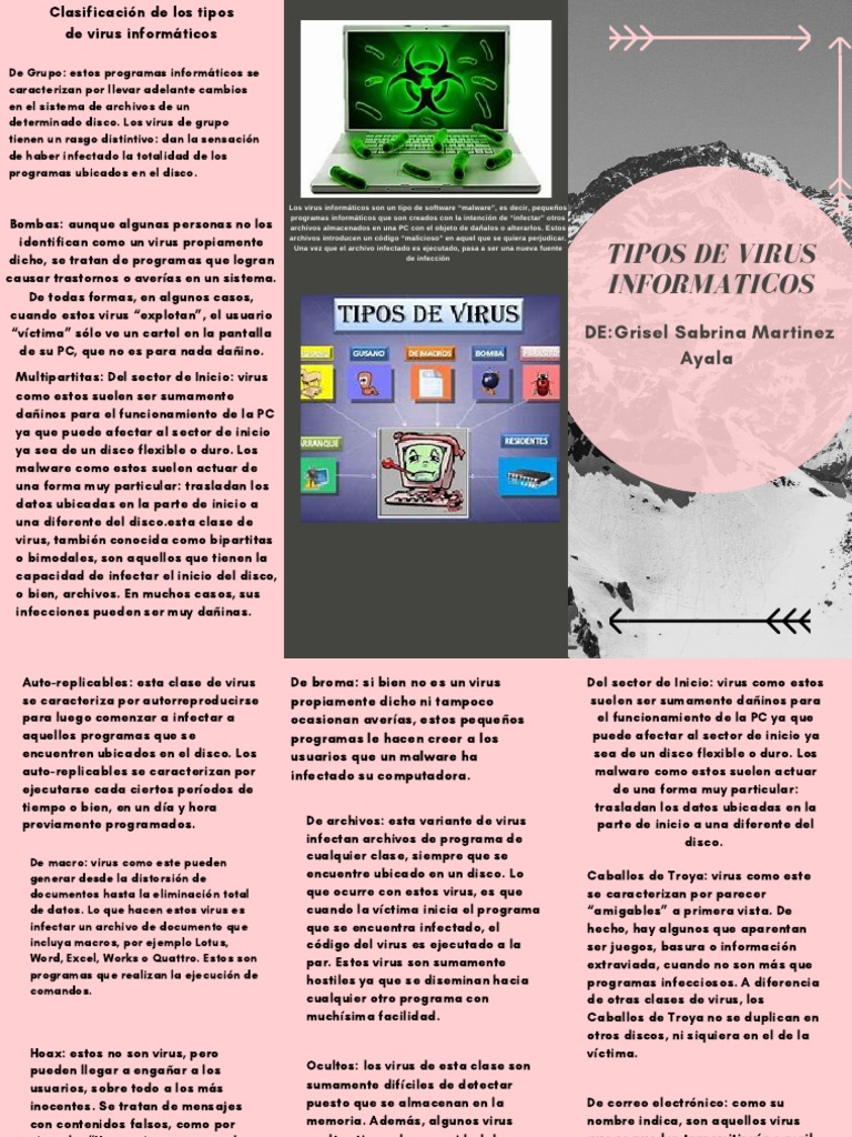 Tipos de virus y malware que pueden infectar Windows Estos son algunos de los formatos y tipo de de virus y malware que pueden atacar a un ordenador cualquierabasado en un sistema Windows 9 tipos de hackers y sus motivaciones | McAfee Blog Los ciberataques sin duda han protagonizado las noticias últimamente, desde ataques de ransomware devastadores que han dejado tanto a empresas como a ciudades enteras inmobilizadas, hasta fugas masivas de datos que exponen la información de millones de clientes. Sin embargo, casi nunca se habla de los hackers. Por supuesto, muchos de ellos ocultan su identidad porque están involucrados en ... Tipos de Antivirus | PDF | Virus de computadora - Scribd TIPOS DE ANTIVIRUS INFORMATICOS. ... eliminacin de un virus de las mismas caractersticas. ... computadora, monitoreando ciertas acciones y funciones del sistema. PDF VIRUS Y ANTIVIRUS - Icesi Existen seis categorías de virus y ellos son los parásitos, arranque inicial, multipartitos, acompañantes, de vínculos y de fichero de datos. Sin embargo podemos identificar veintiuno tipos de virus, que se agrupan en dos partes, el primero se destaca por su destino de infección y el segundo por su activación.-Los orígenes de la ...