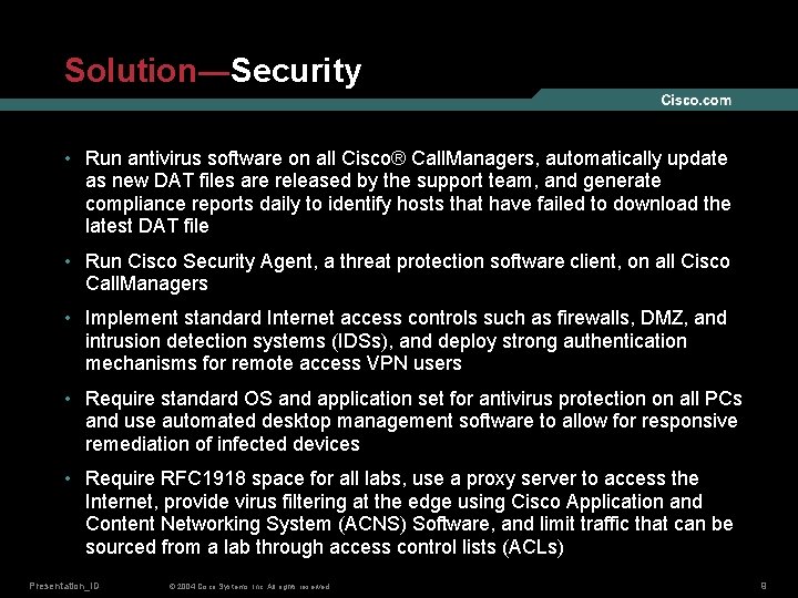 Cisco Security Agent | Securing the Windows Operating System In addition to antivirus protection, you must protect the operating system against other threats from the network, such as DoS attacks. For these issues, Cisco provides Cisco Security Agent software to install on every Cisco CallManager system. Cisco Security Agent Can Offer Potent Protection to ... Another thing that I learned was that, unlike most antivirus software, Cisco Security Agent does not provide the ability to remove any worms or viruses. Once a machine has a worm or virus, you ...