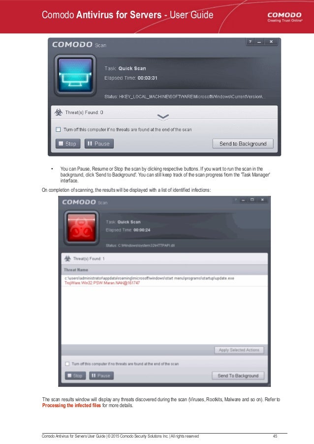 How Antivirus Works? | Comodo Antivirus Key features of Comodo Internet Security. Antivirus Software. The antivirus software works on a proactive-basis to identify and wipe out infections, worms and other malware instantly . Comodo Internet Security clients are provisioned to drag and drop items to the home screen to run an automatic virus scan. Firewall. How to Uninstall COMODO Antivirus: 7 Steps (with Pictures) 1 Terminate "COMODO Scan". 2 Answer Yes to the COMODO Antivirus dialog box to verify you want to end the scan progress. 3 Close the Scan window. 4 Now, find the active antivirus client in taskbar, right click on that tray and choose "Exit" on the menu. 5 Apply Yes to the CA message to quit the program. 6 right click > scan with comodo antivirus won't work in File manager ... The solution for this problem is to add more context menu within Directory opus by insert command "C:\Program Files\COMODO\COMODO Internet Security\cavscan.exe" %1 and it works as it should do. But I think this is not the proper solution because now I have 2 similar context menu named "scan with Comodo Antivirus", the default one
