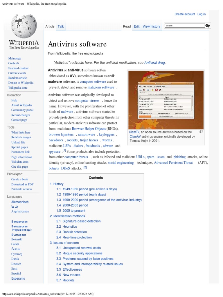 Antivirus software list wiki. Antivirus software - Simple English Wikipedia, the free ... Antivirus software protects computers in many different ways. For starters, most antiviruses offer more than just "virus" protection. They protect computers from all different kinds of malware, like spyware, rootkits, phishing, and ransomware. For this reason, antiviruses are frequently interchangeably referred to as "anti-malware" programs. List of antivirus software | Computer Security Wiki | Fandom This is a list of notable antivirus software, which has not yet made it into the comparison table. List:Antivirus software | Software Wiki | Fandom This is a list of notable antivirus software, which has not yet made it into the comparison... Software Wiki Explore Main Page All Pages Community Interactive Maps Recent Blog Posts Software Most visited articles Program Killer Facebook 3D Movie Maker Arduino GIMP XnView ReactOS Software WindowBlinds μTorrent PuTTY Skype WinSCP Suites GNOME Do Antivirus software - Wikipedia Anti-virus software can attempt to scan for rootkits. A rootkit is a type of malware designed to gain administrative-level control over a computer system without being detected. Rootkits can change how the operating system functions and in some cases can tamper with the anti-virus program and render it ineffective. Rootkits are also difficult to remove, in some cases requiring a complete re-installation of the operating system.