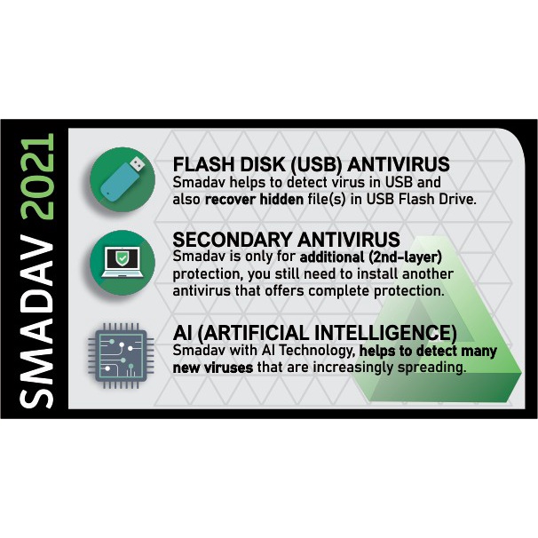 Smadav Antivirus 2022 - Situs Resmi (Official) Smadav 4 Fungsi utama Smadav : 1) Proteksi tambahan untuk PC (komputer), kompatibel dengan sebagian besar antivirus lainnya. Banyak antivirus yang tidak bisa di-install bersama antivirus lainnya, ini dikarenakan antivirus-antivirus tersebut didesain untuk proteksi utama pada komputer anda. Berbeda dengan Smadav yang di-desain sebagai proteksi tambahan ...